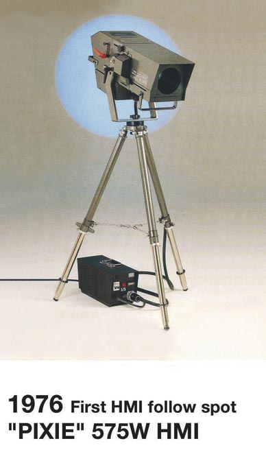 Robert Juliat introduces the first HMI followspot with integrated PSU, the 575 W Pixie, and thereby introduces a concept adopted since by other manufacturers.